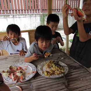 市場に買い出し。みんなでクッキング。生きたかにを蒸し器に入れます。お好み焼きやカレーを作ります。
